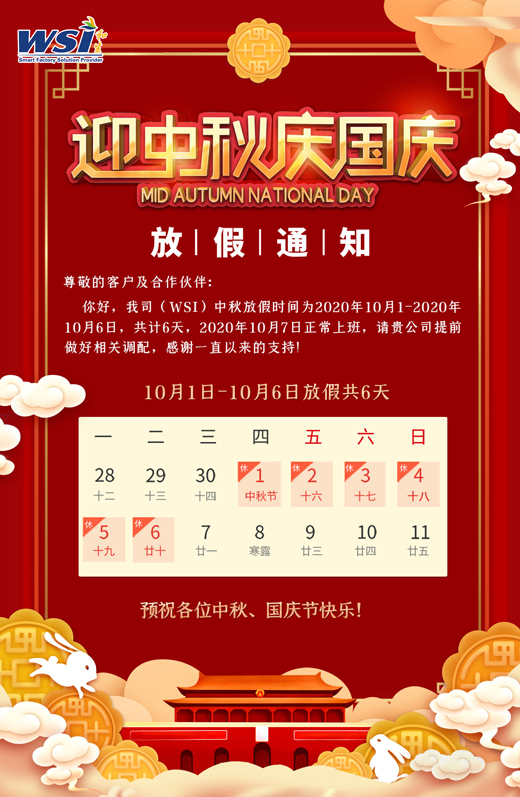 國慶節、中秋節假期將至,根據國家節假日放假規定,并結合公司的實際情況,公司將2020年國慶節、中秋節放假安排如下: