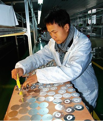 圖為投入試生產的LED車間工作人員在涂散熱材料